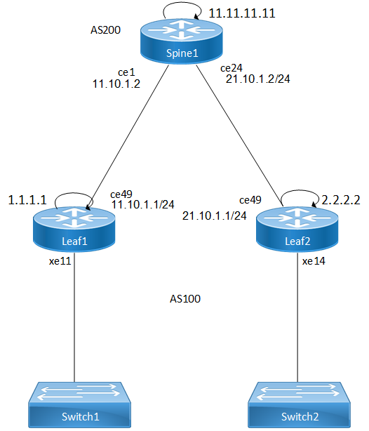 This topology demonstrates the configuration necessary to enable VxLAN VLAN-to-VNID mapping. Leaf1 and Leaf2 are VxLAN VTEPs in the Autonomous System (ASN) 100, and the Spine1 resides in a different Autonomous System (ASN) 200. The setup involves establishing eBGP IPv4 (underlay) neighborship between interface addresses and L2VPN EVPN (overlay) neighborship between loopback interfaces.