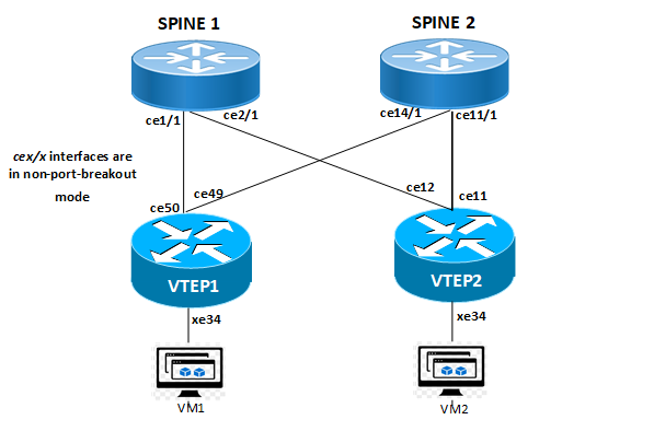 In this configuration, each VTEP (VTEP1 and VTEP2) operates as a multilayer switch. Here, xe34/xe34 serves as the access port for VTEP1/VTEP2 while ce50/ce49 and ce12/ce11 acts as the transport network port towards SPINE1 and 2 respectively.