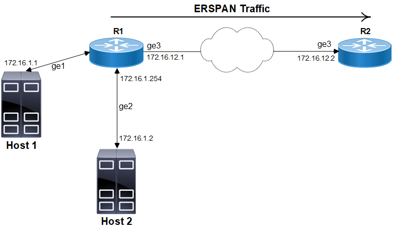 R1 collects the traffic received or sent over one or more interfaces (such as ge1 and/or ge2), mirrors the collected traffic, encapsulates the packets inside ERSPAN and sends them to the IP address on R2.