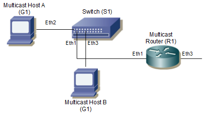 Because IGMP Snooping is used in bridged LAN environments, router R1 does not require running IGMP Snooping, and can run any multicast protocol (such as PIM-SM). Thus, the configuration on R1 is not included in this example.