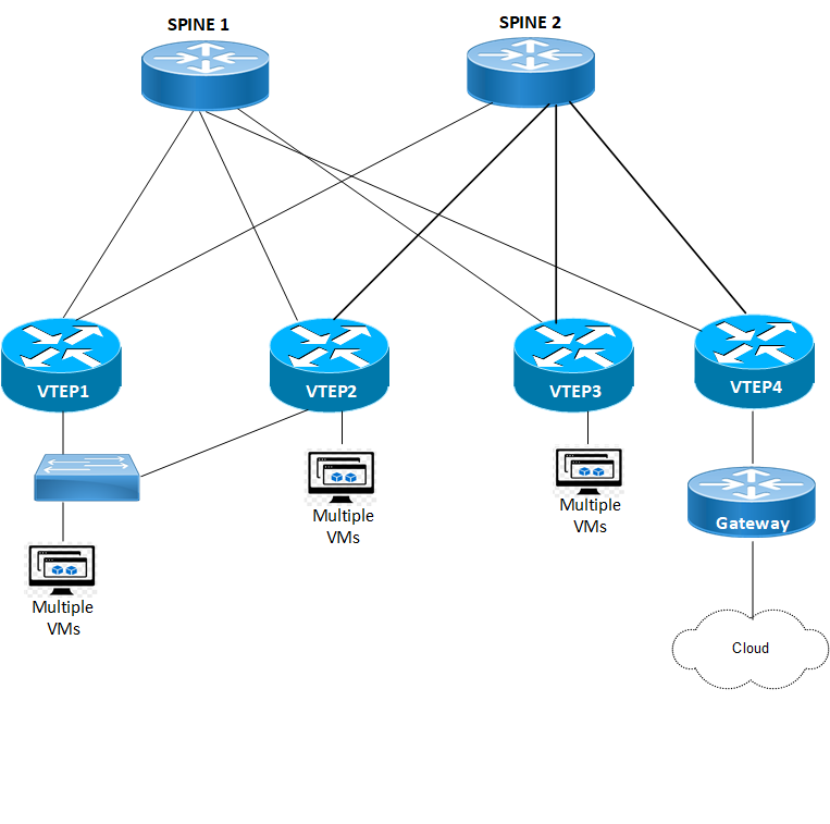 Typically, VxLAN network operates as an overlay network over an IP underlay network based on a Spine-Leaf CLOS architecture. The underlay network is often referred to as IP fabric or CLOS fabric.