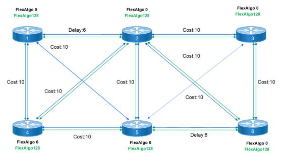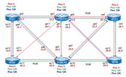 • Shows how both Flex-Algo 0 (blue) and Flex-Algo 128 (green) are configured within the same topology.
