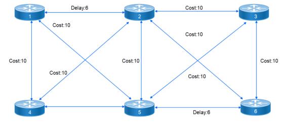 • Delay (TE Metric): Some links (for example: Node 1 to Node 5 and Node 5 to Node 6) have a delay of 6, while others have a delay of 10.