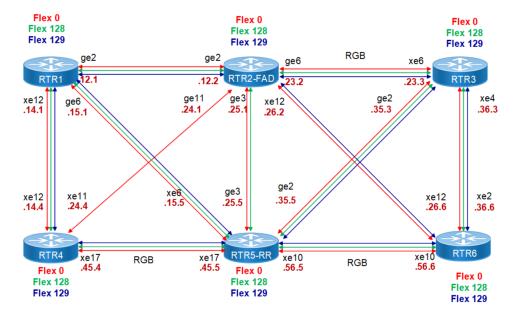 • Red Lines (Flex Algo 0): Represents the default IGP metric-based paths where all links contribute to general traffic forwarding.