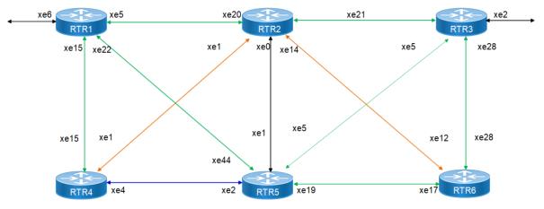 • RTR2, RTR4, and RTR6 function primarily as core (P) routers, forwarding traffic through the network.
