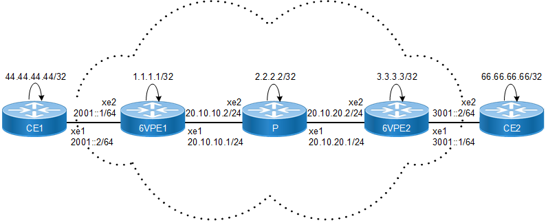 • 6VPE1 and 6VPE2 are IPv6 Provider Edge routers