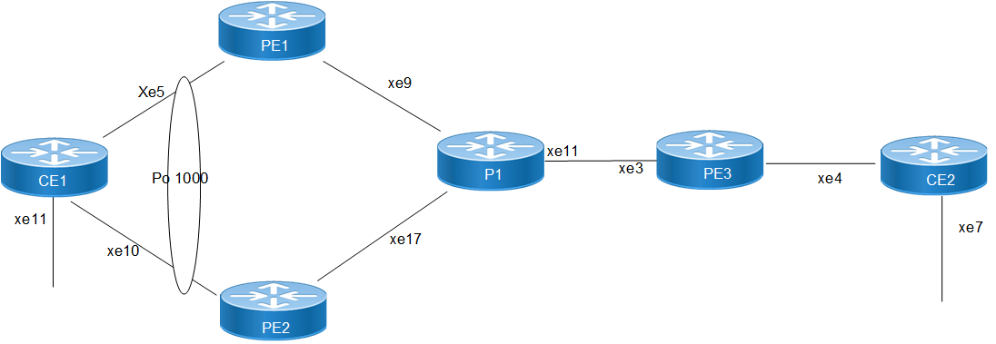 The topology consists of two Customer Edge devices (CE1 and CE2) connected to Provider Edge devices (PE1,PE2, and PE3) through sub-interfaces. The Provider Edge devices are interconnected through Provider device (P1).