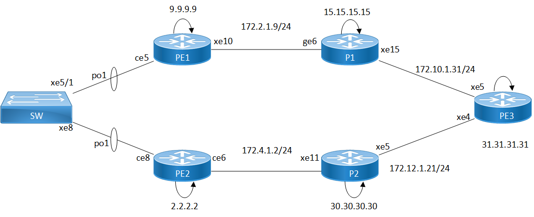 The following topology shows a VPLS mesh. The traffic is flowing from SW to PE3. PE1 has an MLAG configured as Active and PE2 as Standby. When a link failure occurs between SW and PE1 (the Active MLAG node), the link between SW and PE2 becomes Active.