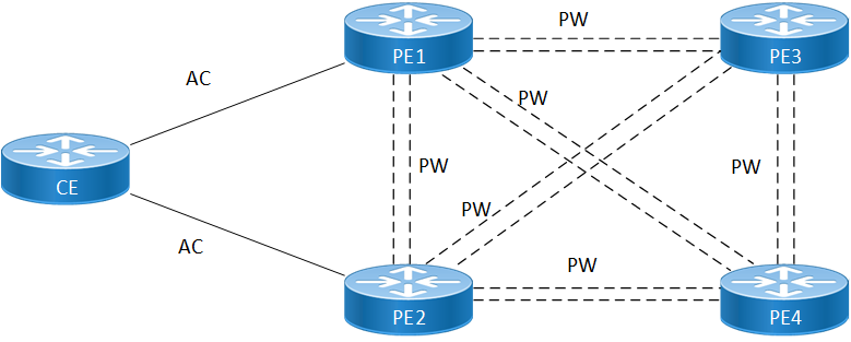 A single CE is dual-homed to two PEs for redundancy is shown in the following figure: