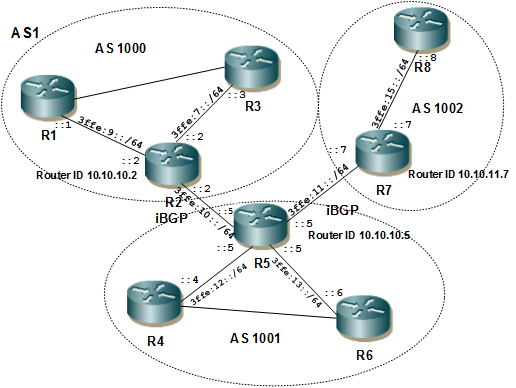 (config-router)#neighbor 3ffe:15::8 remote-as 1002 | Define the BGP neighbor (R8), and establish a TCP session by specifying the IPv6 address (3ffe:15::8)and the AS number(1002)of neighbor R8. |