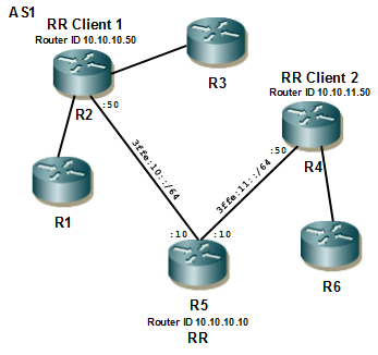 (config-router-af)#neighbor 3ffe:10::50 route-reflector-client | Configure R5 as the Route-Reflector (RR) and neighbor R2 as its client. |