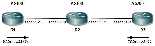 (config-router)#neighbor 3ffe:10::5 remote-as 1001 | Define the BGP neighbor (R5), and establish a TCP session by specifying the IPv6 address (3ffe:10::5) and the AS number(1001)of neighbor R5. |