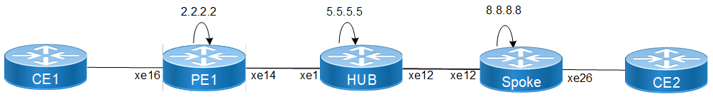 The sample topology for MAC Move Protection with CE-PE-Hub-Spoke architecture.