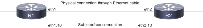 Figure 1-44 shows and example of subinterface configuration. In this example, there are two routers, R1 and R2, and the eth1 interface of R1 is connected directly to eth2 of R2 using an Ethernet cable.