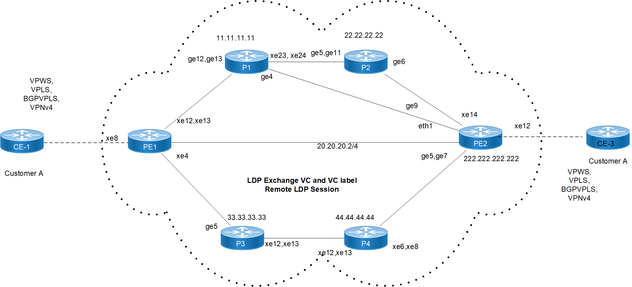 (config-router)#targeted-peer ipv4 222.222.222.222 | Configuring targeted LDP sessions to PE-2 |