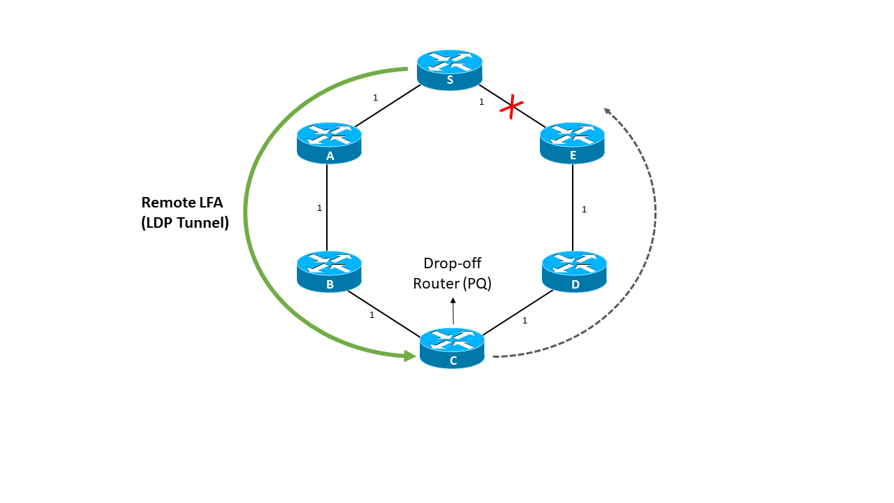 Figure 6-6, S can reach A, B, and C without going via S-E; these form S's extended P-space with respect to S-E. The routers that can reach E without going through S-E will be in E's Q-space with respect to link S-E; these are D and C.B has equal-cost paths to E via B-A-S-E and B-C-D-E, and so the forwarder at S might choose to send a packet to E via link S-E. Hence, B is not in the Q-space of E with respect to link S-E. The single node in both S's extended P-space and E's Q-space is C; thus, node C is selected as the repair tunnel's endpoint. Thus, if a tunnel is provided between S and C as shown in Figure 2, then C, now being a direct neighbor of S, would become an LFA for D and E.