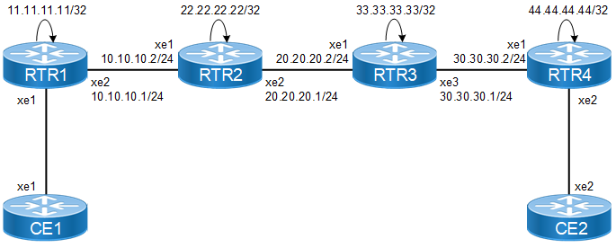 (config)#mpls ftn-entry 44.44.44.44/32 100 10.10.10.2 xe1 | Configure FTN entry for rtr4 loopback. |