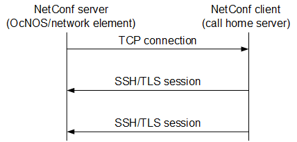 By default, in the NetConf protocol (RFC 6241), a NetConf client application initiates the connection towards the NetConf server in the network element (OcNOS device). However, for certain use cases, such as in the presence of firewalls or NAT, it is useful to have “call home” functionality where the connection process is reversed, and the NetConf server initiates the connection to the NetConf client. As shown in