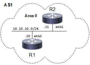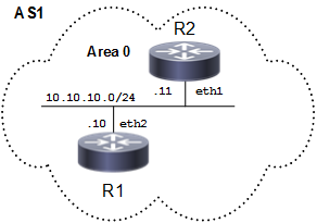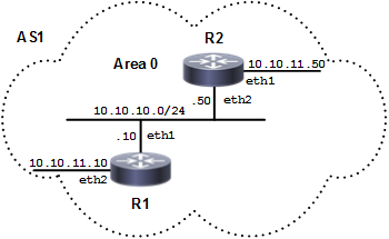 The diagram shows the minimum configuration required to enable OSPF on an interface. R1 and R2 are two routers in Area 0 connecting to network 10.10.10.0/24.