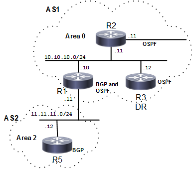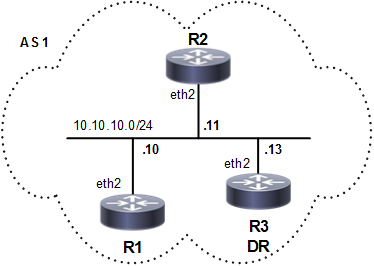 This example shows how to set the priority for an interface. Set a high priority for a router to make it the Designated Router (DR). Router R3 is configured to have a priority of 10, which is higher than the default priority (1) of R1 and R2; making it the DR.