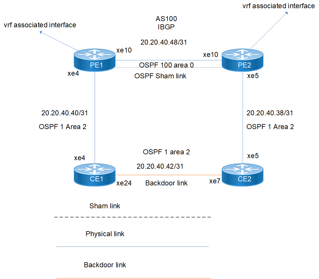 Suppose that there are two sites in same OSPF area and each of them is attached to a different PE router, and there is also an intra-area ospf backdoor link connecting the two sites. There will be routes between sites that go through the PE routers, but these routes will appear to be inter area routes, and OSPF will consider them less preferable than the intra-area routes through the backdoor link. To make a route through the backbone appear to be an intra-area route, it is necessary to make it appear as if there is an intra-area link connecting the two PE routers. Sham-links are those links routes the intra-area routes through the backbone.