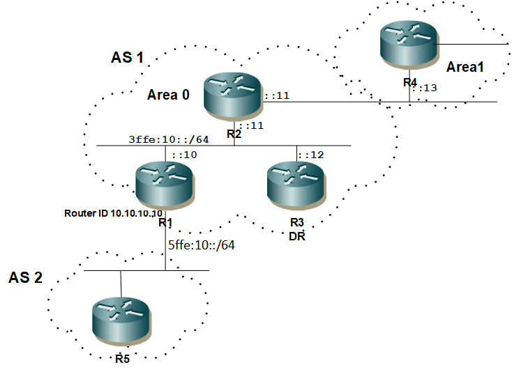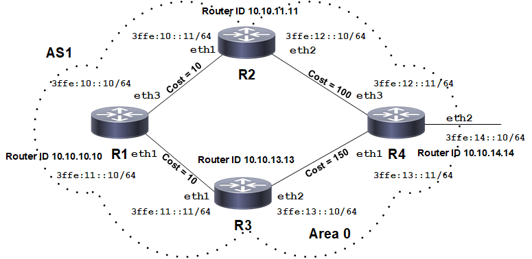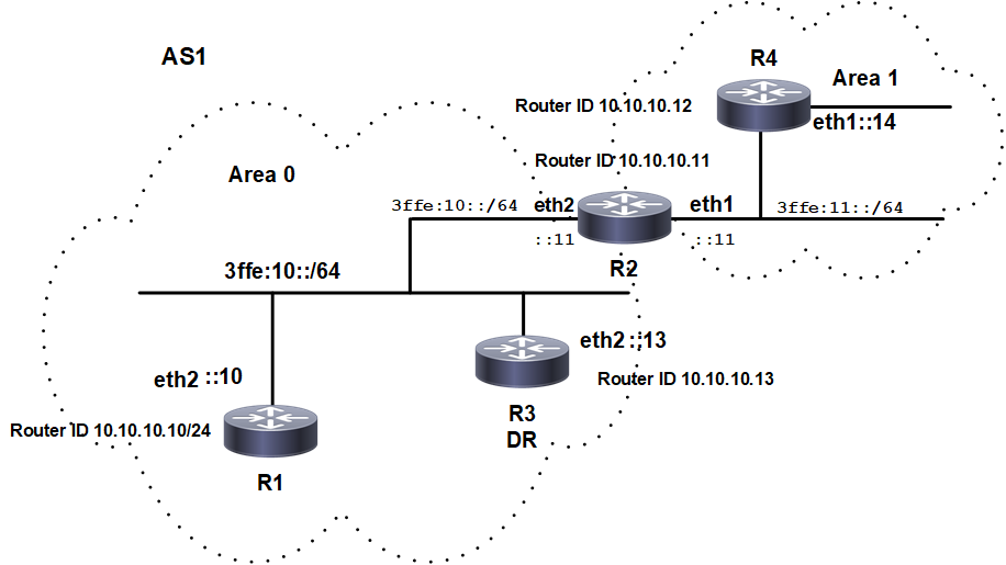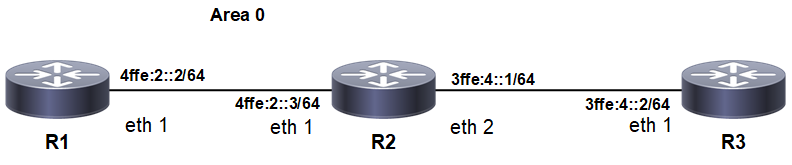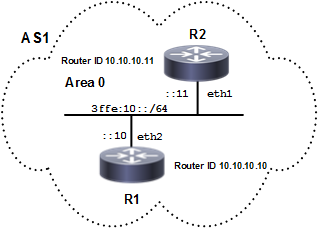 This example shows the minimum configuration required for enabling OSPFv3 on an interface. R1 and R2 are two routers in Area 0 connecting to the network 3ffe:10::/64. After enabling OSPFv3 on an interface, create a routing instance, and specify the Router ID.