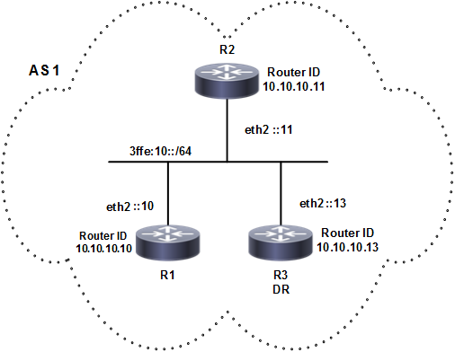 This example shows how to set priority for an interface. Set a high priority for a router to make it the Designated Router (DR). Router R3 is configured with a priority of 10; this is higher than the default priority (default priority is 1) set for R1 and R2. This makes R3 the DR.