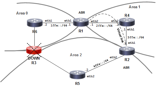 This example shows the configuration required for enabling OSPFv3 authentication with IPSEC on an OSPFv3-enabled interface. R1 and R2 are two routers in Area 0 connecting to the network 2000::/64.