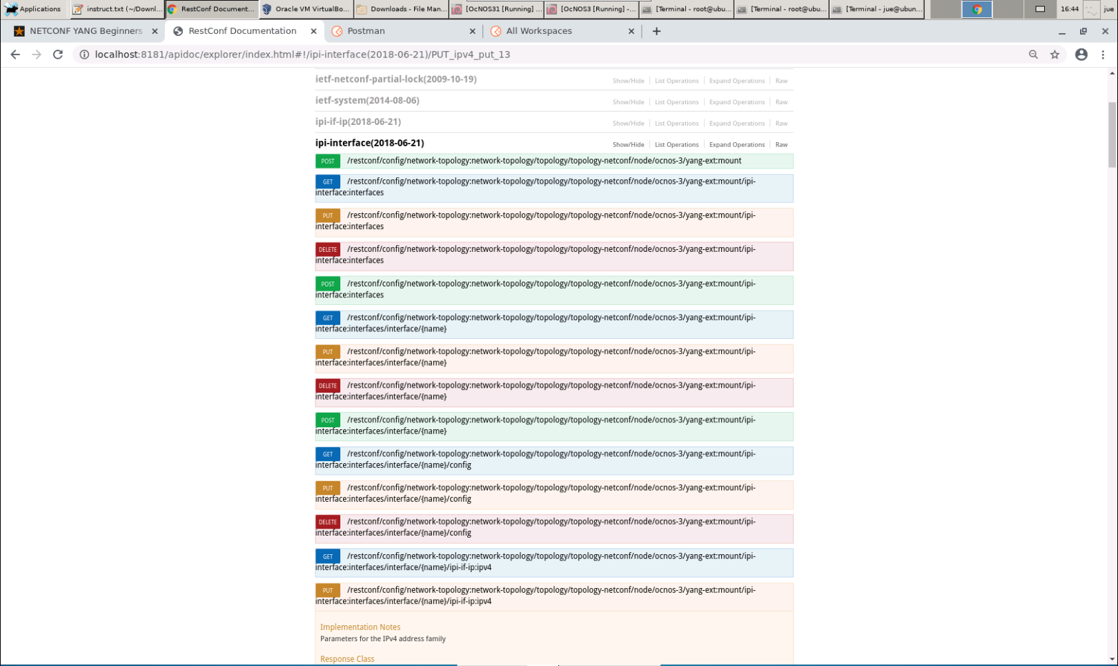 Under the mounted resources of API-DOCS, all the APIs show the possible RESTCON operations which can be performed on the node. In the snippet below, different RESTCONF operations are displayed under ipi-interface API.