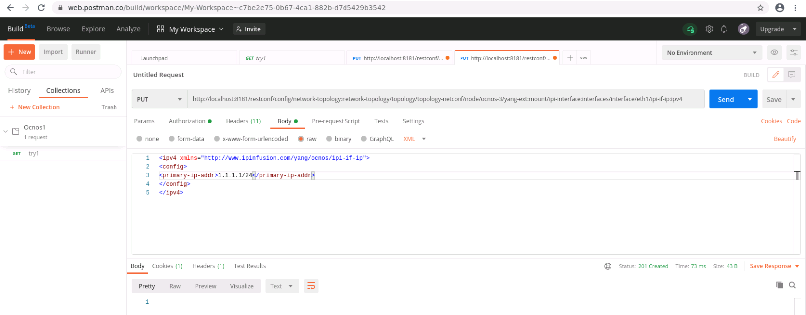 $ curl -user "admin":"admin" -H "Content-type: application/xml" -X PUT http://localhost:8181/restconf/config/network-topology:network-topology/topology/topology-netconf/node/ocnos3/yang-ext:mount/ipi-interface:interfaces/interface/eth1/ipi-if-ip:ipv4 -d '@interface_config.xml'