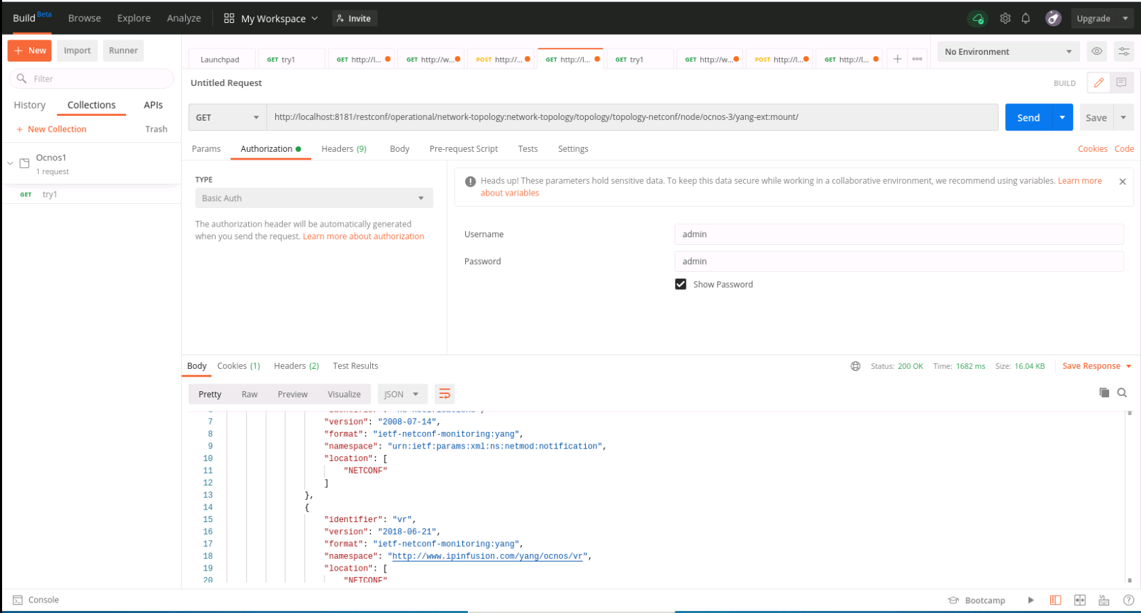 In the configuration of OpenDaylight in the POSTMAN tool, authentication should be set to basic authentication with username and password as 'admin' (as shown in the snippet above).