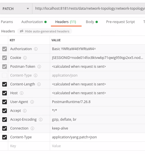 A patch request can be used to modify an existing configuration. Currently, only yang-patch (RFC 8072) is supported. The URL would be the same as the above PUT examples.