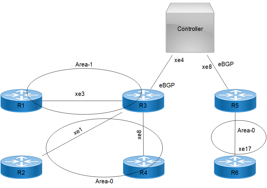 Here we have taken 7 nodes out of which 6 nodes are OSPF-SR enabled routers and node 7 will act as controller. R3 belong to autonomous-system-100 and R5 belong to autonomous-system-200. R1's xe3 and R3's xe3 belong to Area-1. R2, R4 and R3 belong to Area-0 . R5 and R6 belong to Area-0 . We shall configure OSPF-SR on every node. We shall give distribute-BGP-LS on R3 and R5, after that we will make an E- BGP session between R3 and Controller and R5 and controller. Under link-state link-state address family we will activate the neighbors. Verification will be done on ASBRS which are R3 and R5.