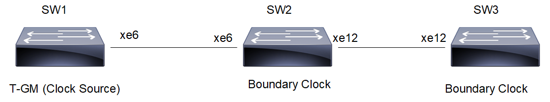 In this example, SW1, SW2 and SW3 are running PTP. SW1 acting as T-GM and SW2, SW3 acting as boundary clock.