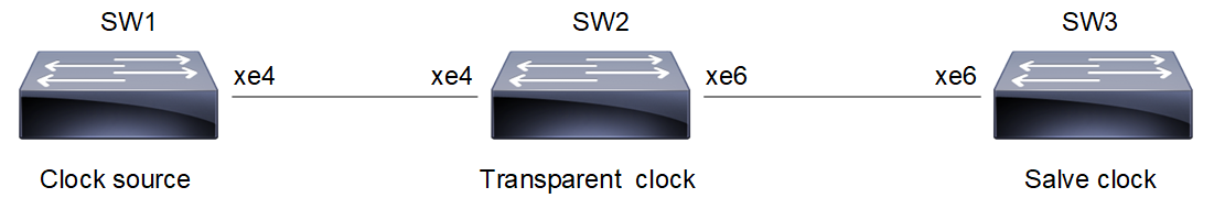 In this example, SW1, SW2 and SW3 are running PTP. SW1 acting as T-GM, SW2 as a Transparent clock and SW3 as a slave clock.
