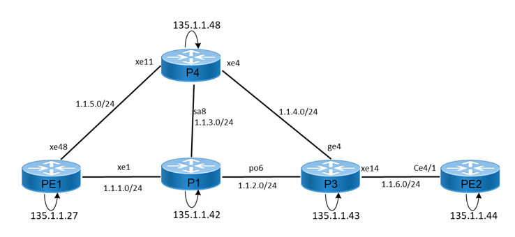 The sample topology includes Edge Nodes (PE1, PE2) and core Nodes (P1, P3 and P4). As per sample configurations, Primary path is defined via PE1-P1-P3-PE2 using strict hops and auto bypass tunnel creation is formed on PE1.