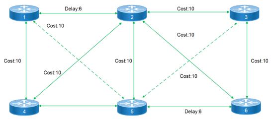 Delay (TE Metric): Some links (for example: Node 1 to Node 5 and Node 5 to Node 6) have a delay of 6, while others have a delay of 10.