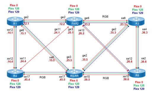 Shows how both Flex-Algo 0 (blue) and Flex-Algo 128 (green) are configured within the same topology.