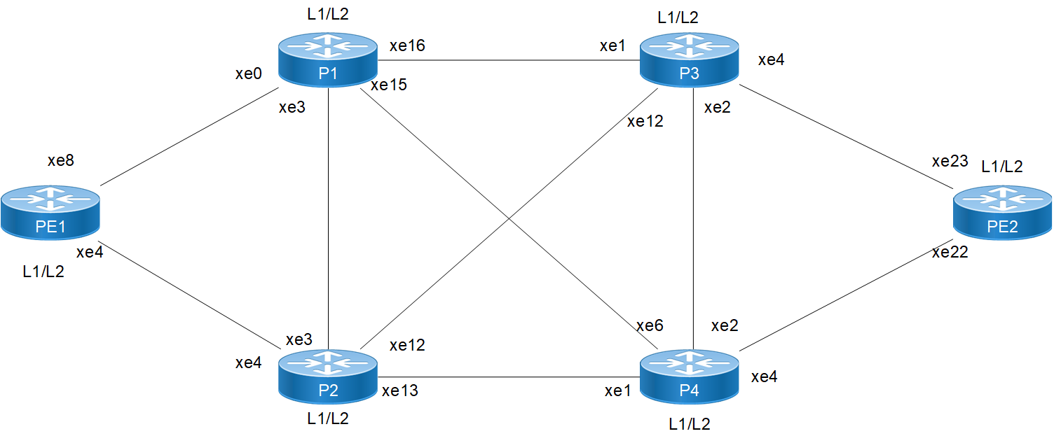 S-BFD is supported only on Qumran2 platforms. The topology below describes active routers PE1,P3,P4, PE2 and as a backup PE1,P2, PE2 with lowest preference.