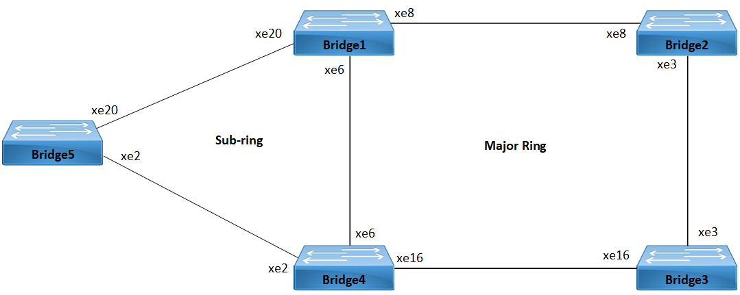 Bridge5(g8032-ring-config)#west-interface xe20.1 | Associate xe20.1 interface as the west interface in subring2. |