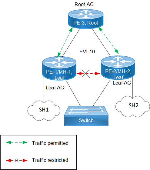 2. Intra-PE communication: Local Split Horizon controls intra-PE communication between Attachment Circuits (ACs) within Leaf PE nodes, ensuring that traffic between ACs does not egress to other Leaf ACs.