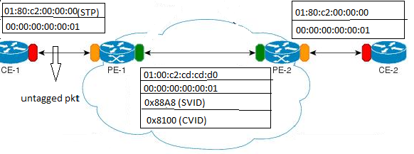 • MAC Rewrite: The original multicast DMAC is replaced with a predefined tunneling multicast address: 01-00-C2-CD-CD-D0. This "hides" the control frame from intermediate provider switches.