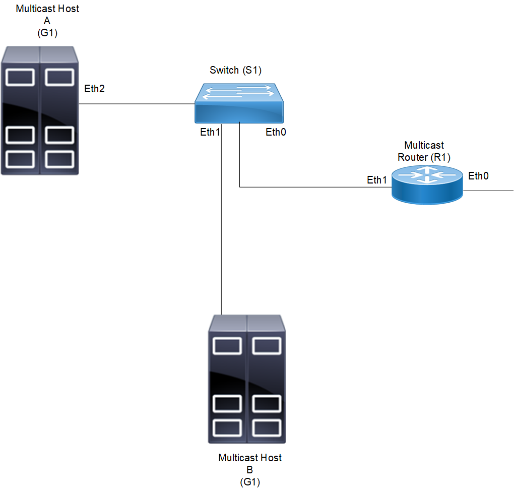 In this topology, switch S1 configures eth1 as a multicast router port. Since MLD Snooping manages multicast traffic in bridged LAN setups, router R1 does not need to run MLD Snooping and can instead utilize any multicast protocol like PIMv6-SM. Therefore, this example focuses solely on configuring switch S1, and does not cover configuration details for router R1.